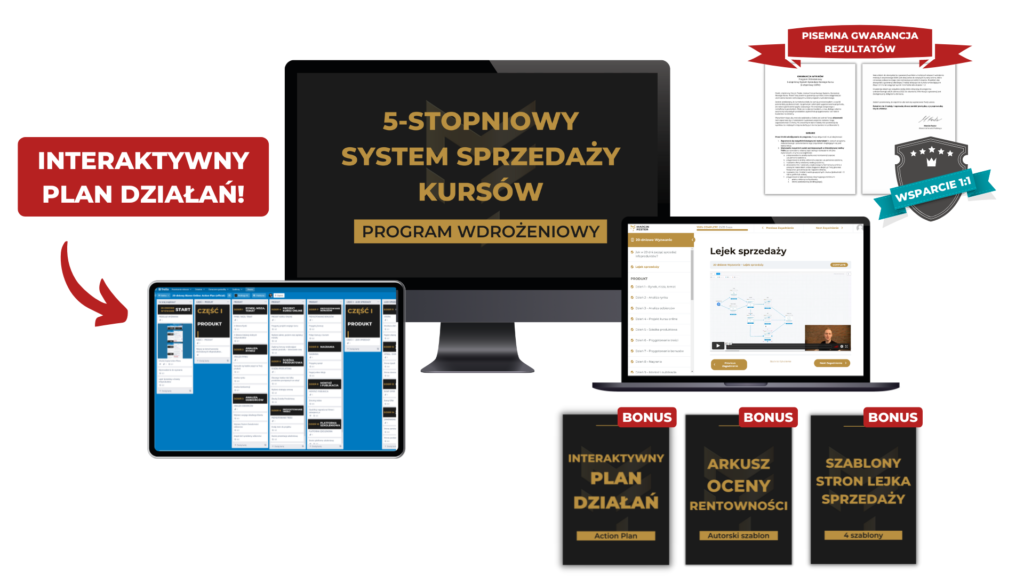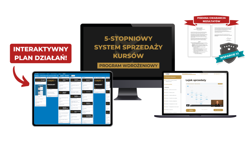 Przygotowałem dla Ciebie gotowy plan wdrożenia 5-stopniowego Systemu Sprzedaży Kursów, w którym otrzymasz niezbędną wiedzę + zadania do wdrożenia. Można powiedzieć, że prowadzę Cię za rękę krok po kroku przez tworzenie lejka sprzedaży.