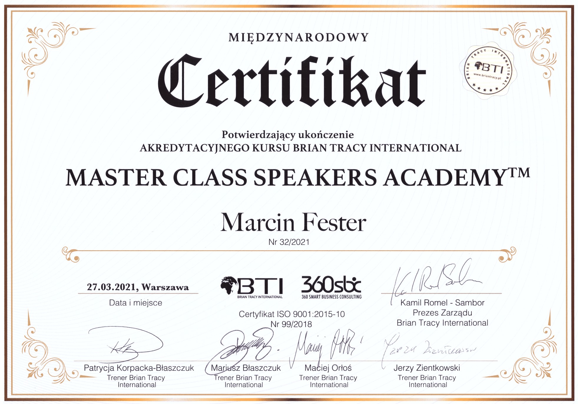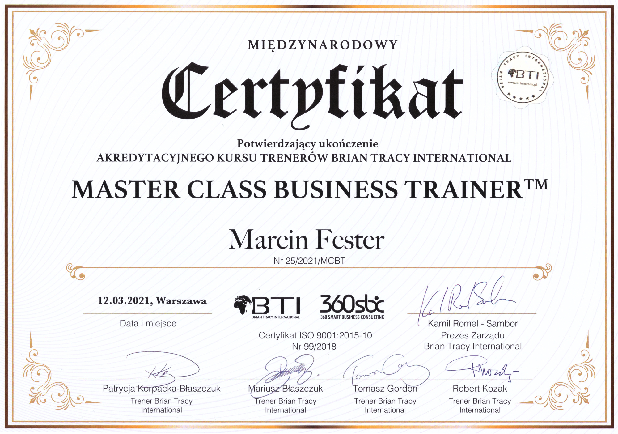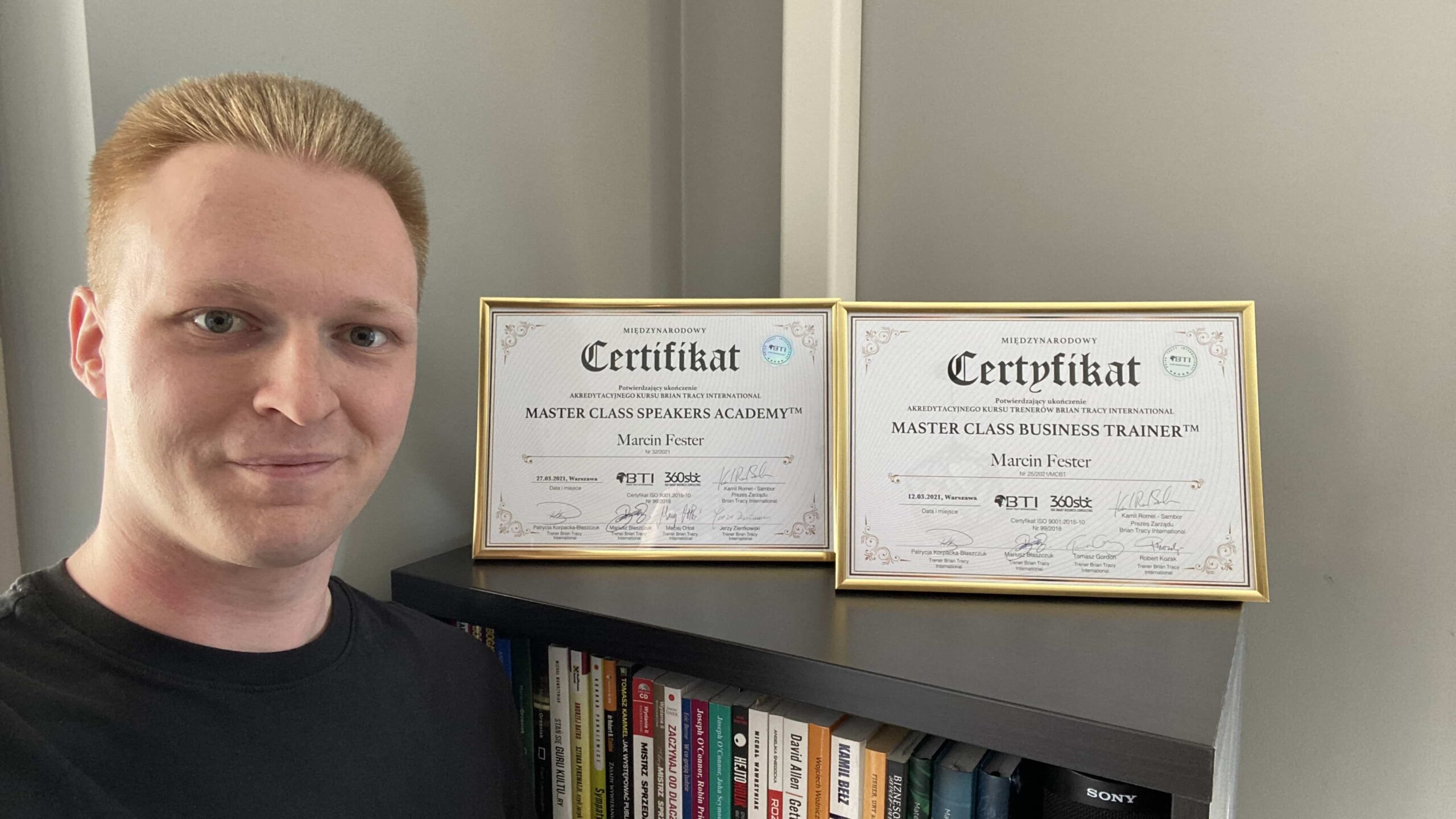 Ukończyłem akredytacyjny kurs trenerski Master Class Business Trainer™ oraz kurs mówców Master Class Speakers Academy™, zorganizowane przez Brian Tracy International. Zdobyłem dzięki temu wiele cennych doświadczeń od najlepszych szkoleniowców i mówców w Polsce. Dzięki temu masz pewność, że wiedza, którą przekazuję oraz sposób w jaki to robię jest na najwyższym, światowym poziomie.